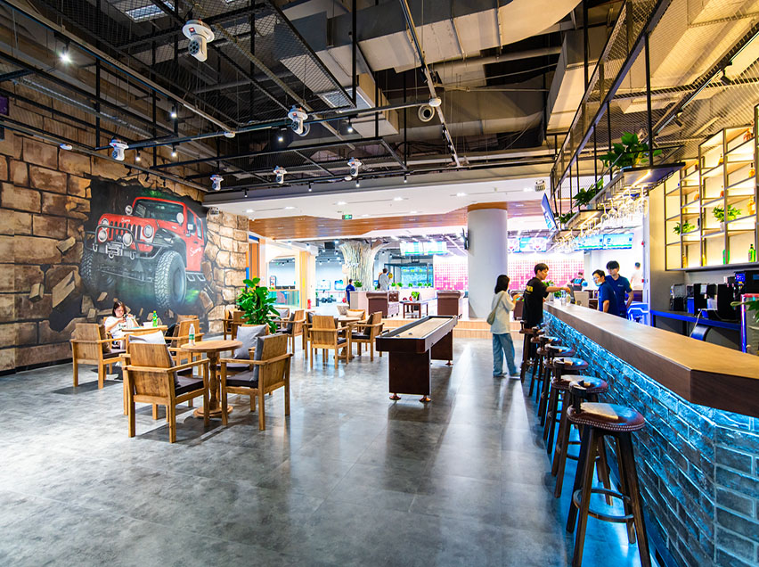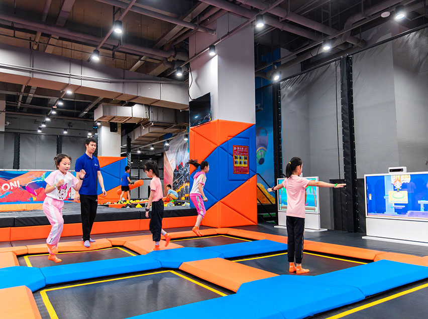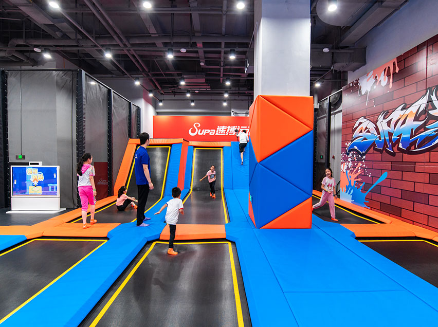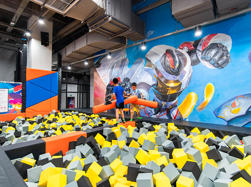 蹦床館主題包裝應(yīng)對應(yīng)大眾人群的喜好來量身設(shè)計才更能夠突出樂園的多元化屬性。裝修設(shè)計高大上的蹦床樂園一般會將多種形式的休閑、娛樂、餐飲空間集中置于一個較大的室內(nèi)空間中,大廳通常采用大跨度玻璃屋蓋以使得室內(nèi)陽光充足、綠樹水池曲徑通幽,使游客享受到到置身于大自然環(huán)境中的美妙感覺。