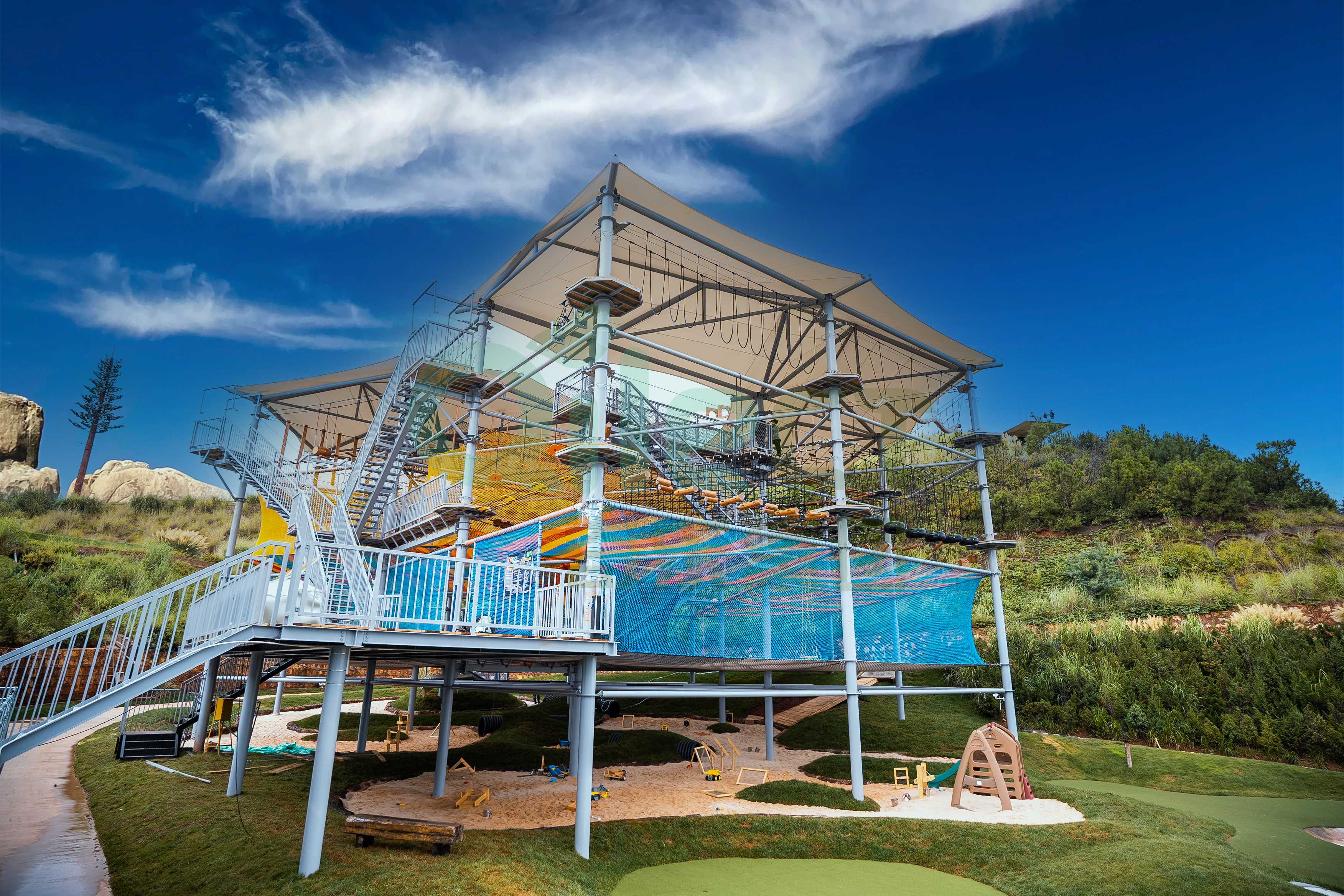 一座大型水晶塔的空中步道總長可達(dá)數(shù)百米,包含百余種趣味關(guān)卡,能夠同時容納上百名游客進(jìn)行探險。更重要的是,通過科學(xué)的分層路線規(guī)劃,它能覆蓋從4歲兒童到成年人的全年齡段客群。孩子們可以在低齡區(qū)鍛煉勇氣,青少年和成人則可以挑戰(zhàn)更具難度的攀爬網(wǎng)、高空步道以及令人腎上腺素飆升的頂層速降項目。這種家庭全員可參與的特性,是其能引爆社交傳播和家庭出游市場的關(guān)鍵。